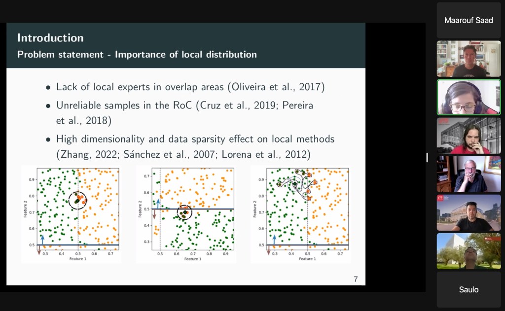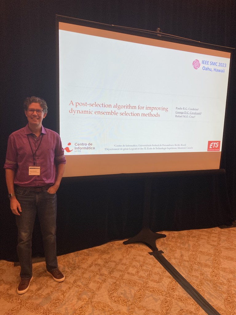 Apresentei o artigo A post-selection algorithm for improving dynamic ensemble selection methods que foi desenvolvido em parceria com Rafael Cruz (ETS, Canadá) e Paulo Roger (aluno de doutorado no CIn-UFPE). Este artigo propõe uma abordagem que seleciona on-the-fly a melhor técnica de Dynamic Selection (DS) por instância de teste. Logo, o artigo tem o objetivo de endereçar a seguinte pergunta de pesquisa: como escolher a melhor técnica de DS por instância de teste? Esta pergunta leva a uma reflexão sobre se precisamos de mais e novas técnicas de DS ou se as técnicas de DS existentes já seriam suficientes para se obter uma boa precisão global do sistema. O artigo conclui que as técnicas que DS são complementares e que o framework proposto é capaz de melhorar a precisão do sistema quando comparada à cada uma das técnicas de DS isoladamente.