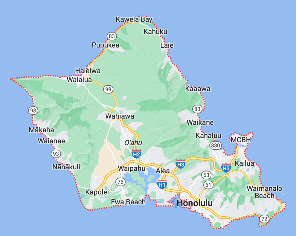 A ilha de Oahu é a terceira maior ilha do Havaí; mas, é pequena. A maior distância entre dois pontos da ilha é de, aproximadamente, 70 km. Por outro lado, esta é a ilha mais populosa do Havaí com um milhão de habitantes.