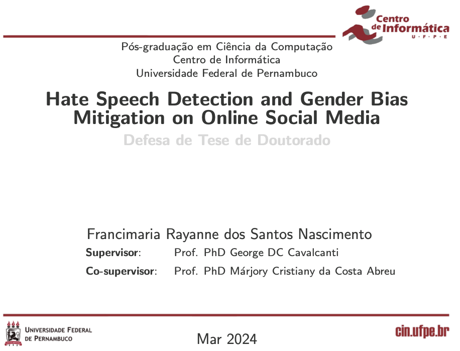 Nesta data emblemática, depois de quatro anos, Fran defendeu seu doutorado abordando um assunto atual, importante e de alta relevância: mitigação de viés em discurso de ódio. O título de sua tese é: Hate Speech Detection and Gender Bias Mitigation on Online Social Media.